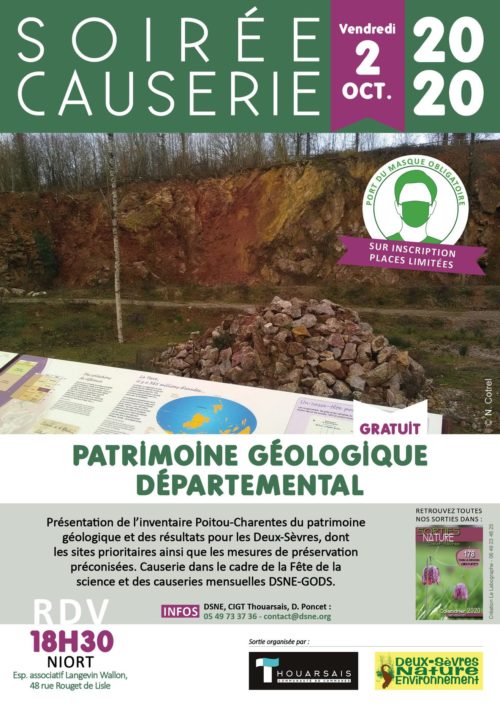 Présentation de l’inventaire poitou-charentes du patrimoine géologique et des résultats pour les deux-sèvres, dont les sites prioritaires ainsi que les mesures de préservation préconisées. causerie dans le cadre de la fête de la science et des causeries mensuelles dsne-gods.